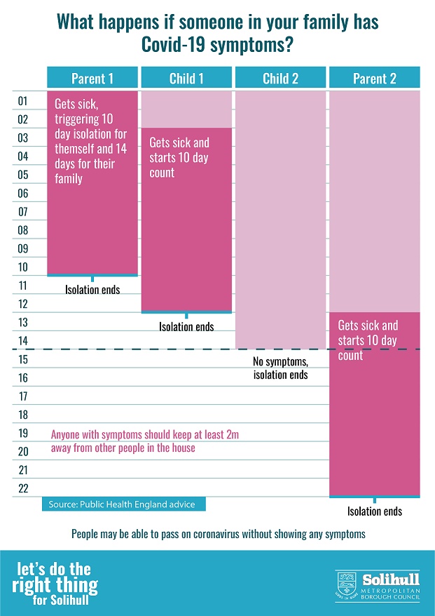 I have been told that there has been some confusion about the self-isolating rules amongst those who have unfortunately caught the virus, have the symptoms or have been contacted by test and trace, in terms of how the rules affect the rest of the household. To work out how long isolation should last we have produced a handy visual guide to make it clear what you need to do.